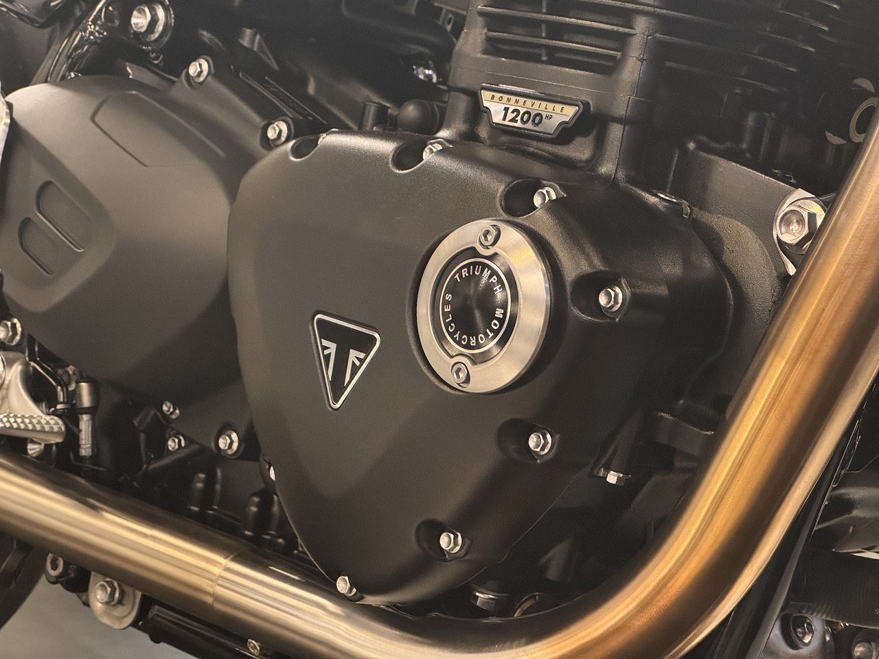 削り出しのバーエンドミラーとスタイリッシュなブラウンシートの仕上げが目を引き、リブ付きのクラッチバッジ、オルタネーターカバーバッジ、ブラックのヘッドボルトカバーなど