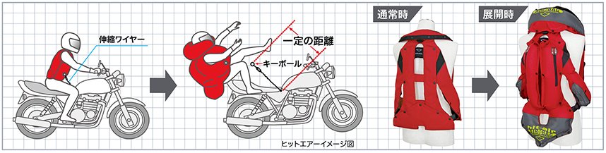上記画像のようにバイクと離れた際にエアバックが作動する仕組みです。