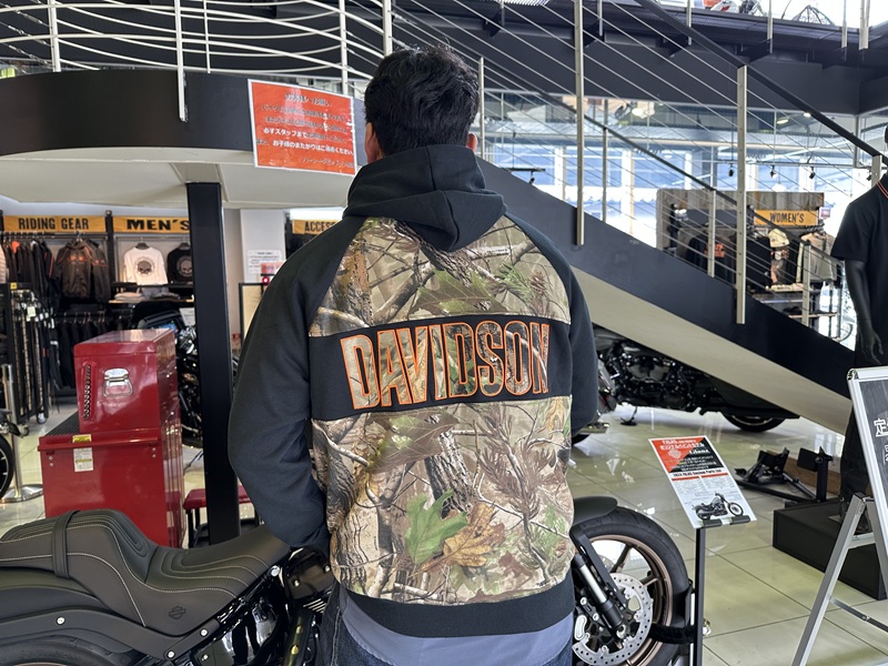 フーディーは黒と合わせたバイカラーデザイン、前後にHARLEY-DVIDSONをあしらいそのロゴもREALTREE仕様。